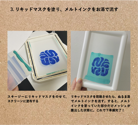 リキッドマスクは感光材の代わりで、乾燥させることでスクリーンの網目を塞ぎ、インクが通らなくなります。