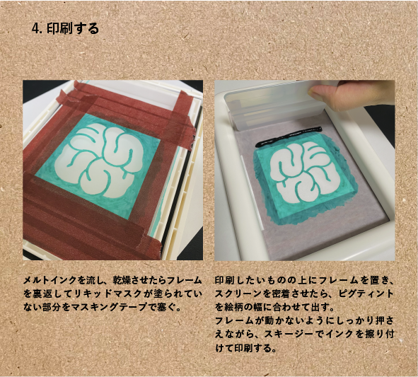 フレームが動かないようにしっかり押さえながら、スキージーでインクを擦り付けて印刷します。