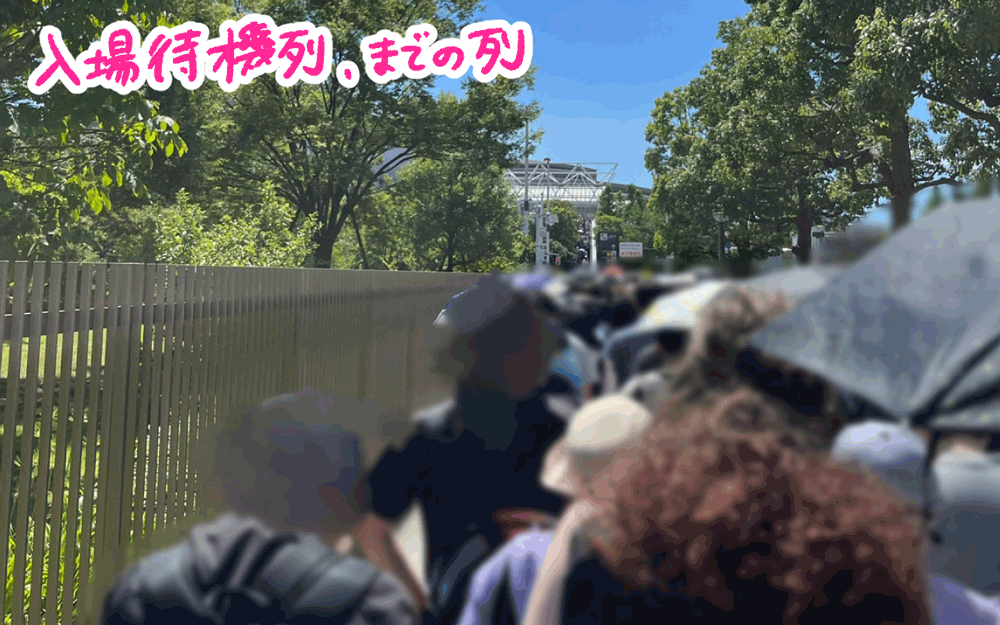 入場まではその場で座って待ちます。アスファルトはアツアツになっていて、座るとお尻が焼ける…でもお尻をつけないと足が疲れてしまう…灼熱の太陽の下…入場時間まではここでじっと待機しなくてはなりません…