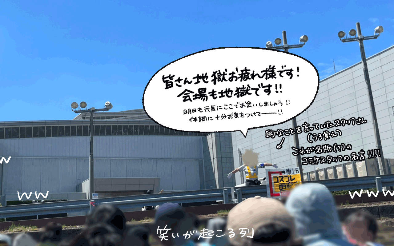 戦士となり列を成して東京ビックサイトへ向かいます。駅からビックサイトまでの最短ルートではなく、入場の待機列まで移動する必要があり、ビックサイトの周りをぐるっと遠回りしていきます。待機列まではコミケ運営のスタッフが誘導しており、とてもスムーズでした。暑い中ご苦労様です…。