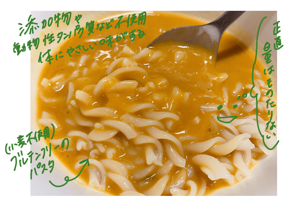 上記を含まず、野菜や穀物を多く含むもので、私が食べたのはこんな感じのレトルトのパスタです。おいしい。健康的な味がする(でも量は物足りない)