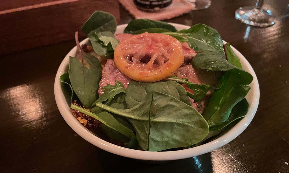 フムス(ひよこ豆をペーストひよこ豆をペースト状にしたもの)を添えてもらいました。マッシュポテトよりさっぱりしていて少ししょっぱめ。クラッカーとの相性1000%マッシュポテトが好きな方は絶対好きな一品