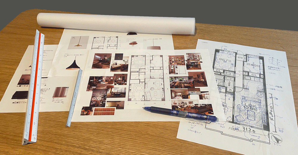 そして次は実測した寸法をもとにきちんと作図用のソフトで図面を描き、理想の部屋をイメージしながらたくさんの写真を保存して、繰り返しコラージュを作成する。普段の業務と同じような工程なので職場でやっていても不自然ではない。