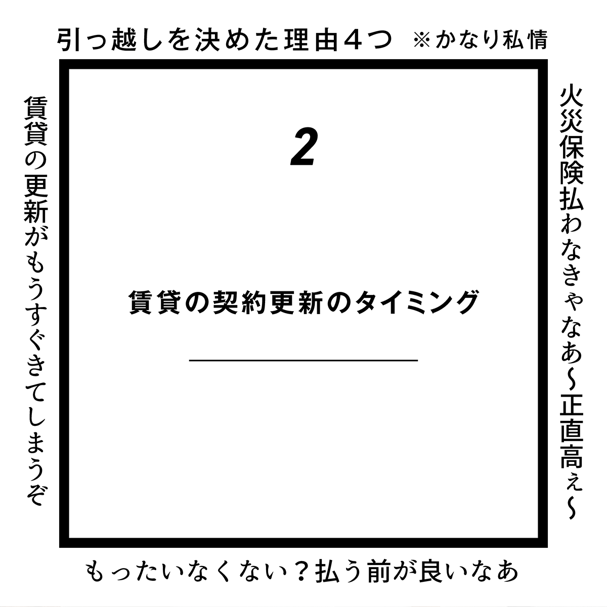 わたしが住んでいたマンションは1年更新で、引っ越すタイミングはいつでも良かったのですが、火災保険が2年更新だった為、払ったのに引っ越すのは勿体ないかな?と思い、引っ越すなら偶数年と決めていました。(その後知ったのですが、火災保険を途中で解約した場合、使わなかった分は返金されるそうです。わたしは満期ピッタリで解約したので返金はありませんでした。)