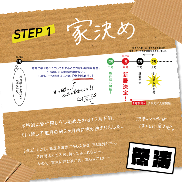 新居が決まり、まずは賃貸マンションの管理人さんに退去することを連絡しました。確実なリミットを設けて引っ越しを絶対的にしました。Xデーから逆算して計画を立てます。