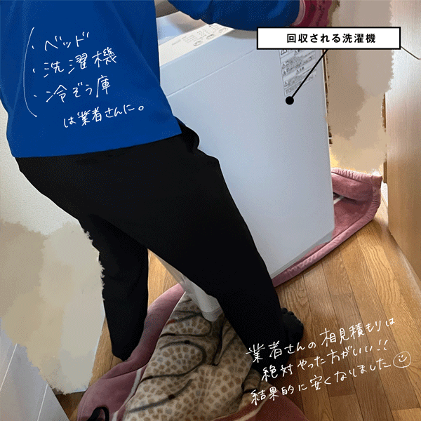 ベッドと家電は回収業者へ依頼。1人で運び出せないものはプロへ任せた方が確実です。ネットで調べて数社に連絡をとり、相見積もりを行いました。その中で評価が高く見積もり金額が安かった業者さんに決定。業者によって金額やプランが違うため、よーく内容を吟味しました。