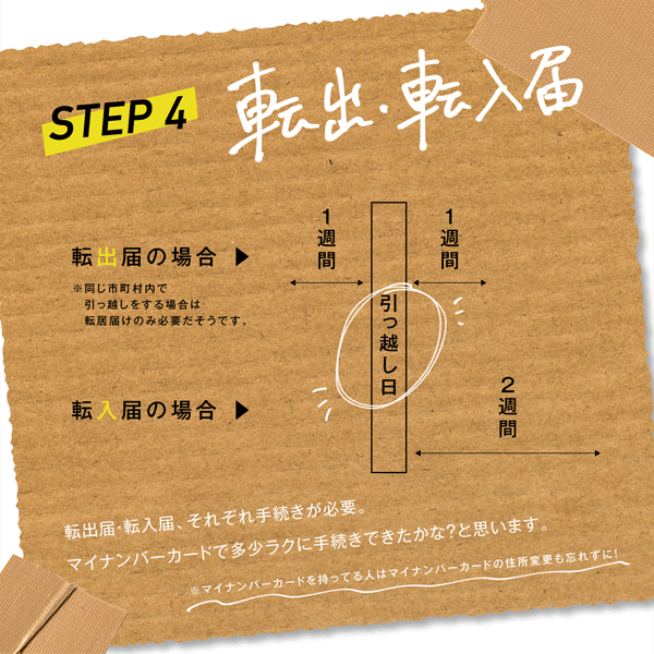 引っ越し日の前後一週間のうちに区役所へ転出届を出す必要があります。本来なら区役所へ行き、書類で手続きしなくてはならないのですが、最近ではマイナンバーカードがあればweb上で手続き可能です。わたしはマイナンバーカードを持っていた為、web上で転出届を提出しました。引っ越し先での転入届は区役所で手続きします。それも転入届を出す前にweb上で区役所へ行く日の予約もできました。凄い。
