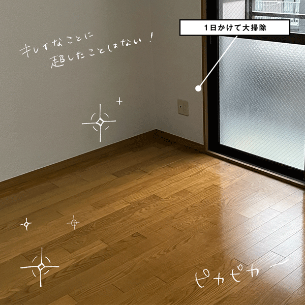 部屋もすっからかんになり、あとは部屋を出るだけ!の状態になりましたが最後の最後に掃除も入念に行いました。部屋を出た後、ハウスクリーニングが入りますが、もし!想定していなかった修繕費を請求されたら嫌だ。(退去費用を高額に請求されたという動画を見漁ってビビっていた)なので、後悔のないよう新居同然にピッカピカにしました。それに、汚い状態で部屋を出るより、今までお世話になった部屋に感謝を込めて掃除をしました。その方が気持ちいい!そう思います。