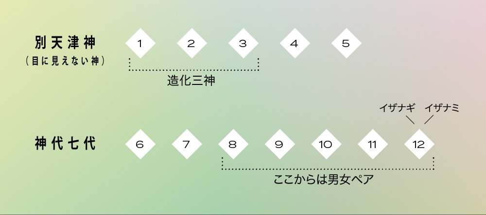 何もない混沌から様々な神が生まれます。その時に生まれた神様をざっくりグループにすると、別天津神と神世七代(かみのよななよ)に分かれます。神世七代で最後に現れたのが、皆さんも多分どこかで聞いたことのある「イザナギ」と「イザナミ」です。