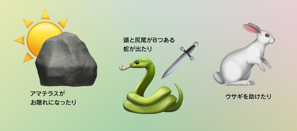 そのあとも、八岐大蛇(ヤマタノオロチ)とスサノオの話や、因幡の白兎と大国主命(オオクニヌシノミコト)の話など、有名なものがたくさん!色々あって(?)大国主命によって国造りが完成されてるのですが、ここでまたアマテラスが登場するなどワクワクする展開が。