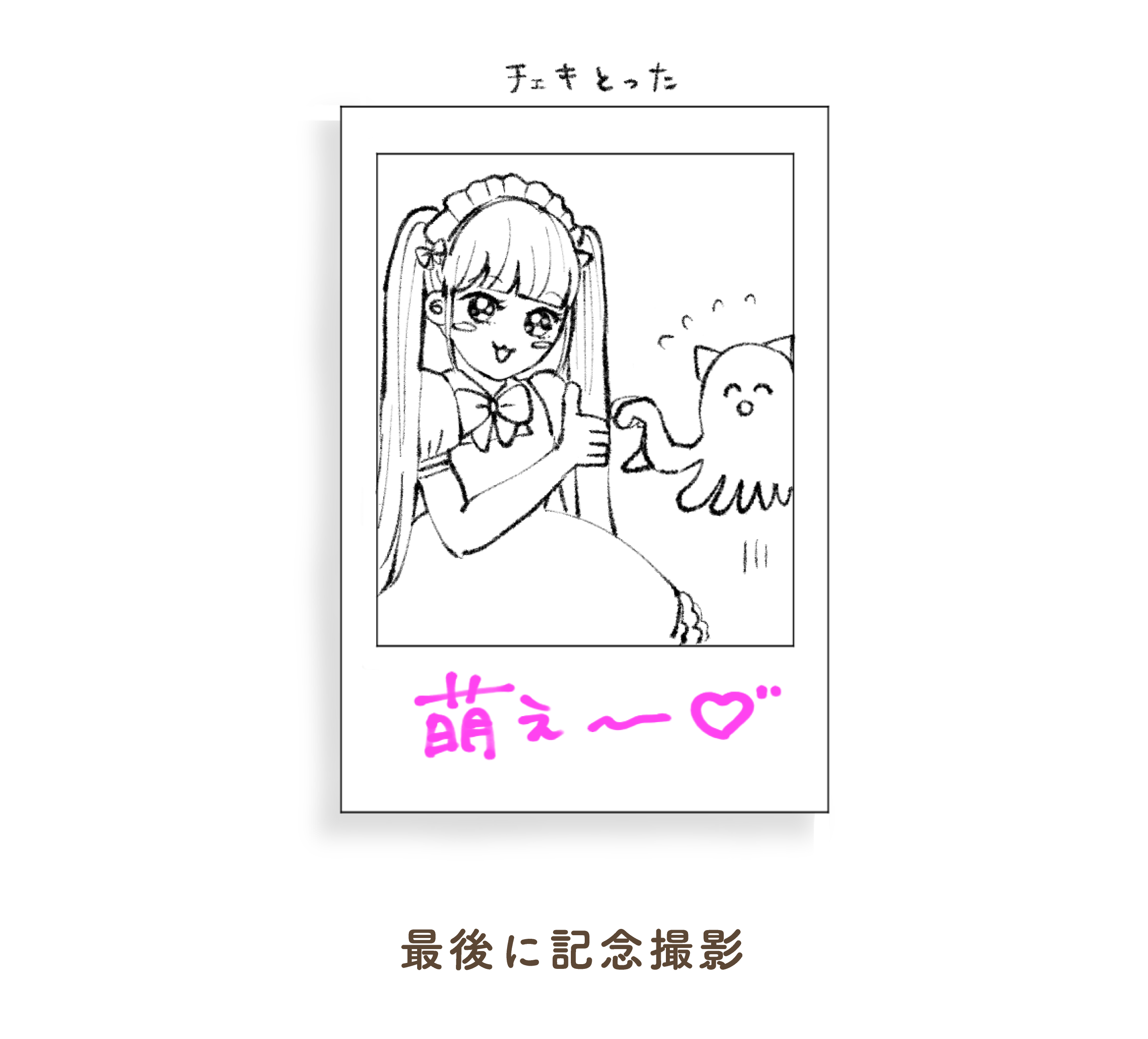 最後に記念撮影でメイドさんとチェキを撮ることができます。撮る相手を指名できるので、推しのメイドさんがいればその子を指名することもできます!私たちは一番席についてくれたメイドさんを指名してチェキを撮ることにしました。メイドさんがチェキにかわいくおえかきをしてくれます!