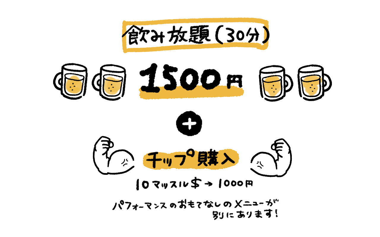 飲み放題(30分)1500円で、わたしは友達と1時間過ごしました。+チップを購入し、そのチップでパフォーマンスのおもてなしを受けることができます。