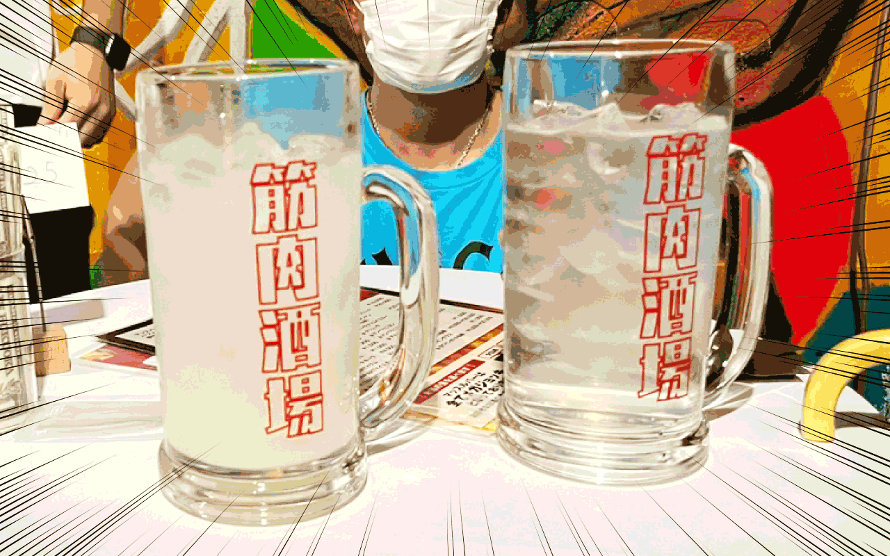 飲み放題のドリンクメニューですが、飲み物の名前に「マッスル」がついています。マッスルハイボール、マッスルレモンサワー、マッスル梅酒ソーダ…注文するとき元気よく飲み物の名前を復唱もされるのでめっちゃ恥ずい。