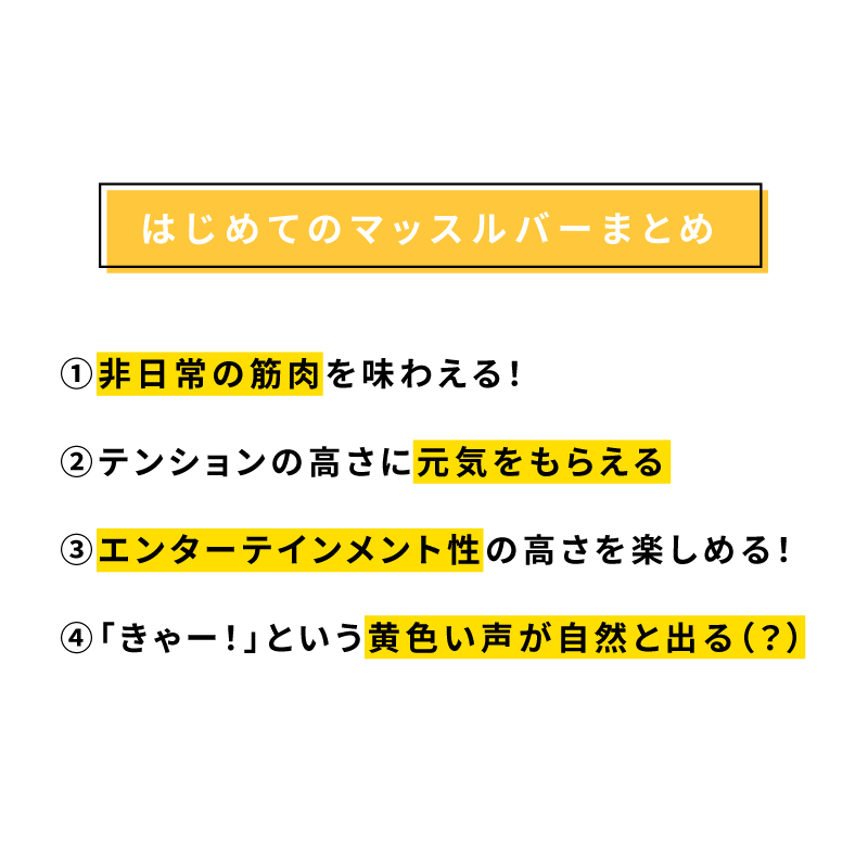 マッスル俵抱っこも友達が注文していたマッスルタワーもアトラクション系パフォーマンスで、マッスルお兄さんに漫画でしか見たことない持ち方で抱えられるのが新鮮すぎてとても面白かったです。
