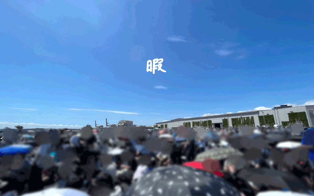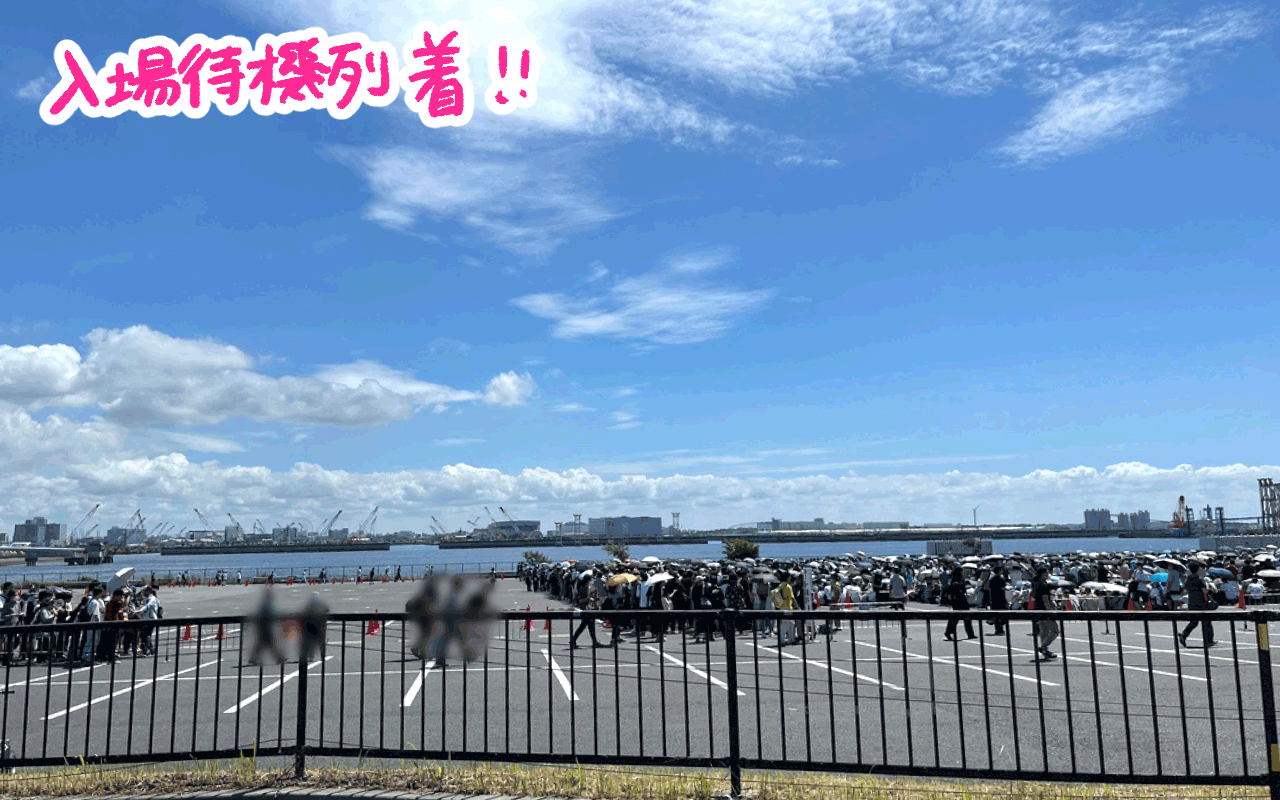 入場まではその場で座って待ちます。アスファルトはアツアツになっていて、座るとお尻が焼ける…でもお尻をつけないと足が疲れてしまう…灼熱の太陽の下…入場時間まではここでじっと待機しなくてはなりません…