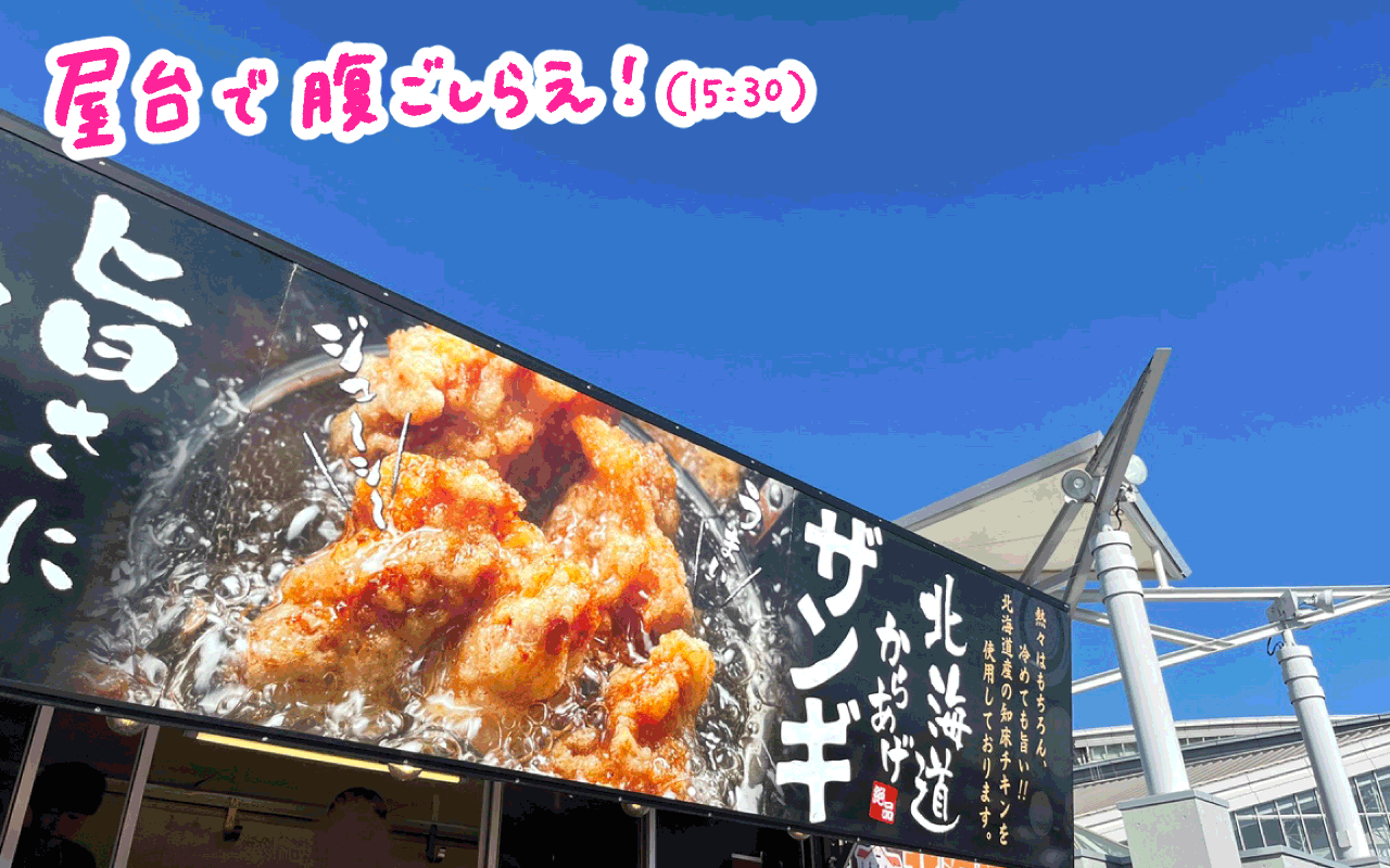 コスプレエリアではレイヤーさんを見たり、写真撮影をすることができます!アニメキャラのコスプレをしている方もいれば、その年の時事ネタのコスプレをする人もいたり様々で見て回るだけでかなり目が忙しいです。写真を撮るときはレイヤーさんに一言声をかけて撮りましょう!屋上展示場には屋台も出ていました!朝から水しか飲んでいなかったのでここで唐揚げとフローズンいちごを頂きました。