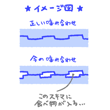 正しい噛み合わせになっていないと、上下の歯の間に隙間が増えるのでその隙間に食べ物が入り込んでしまい、なかなか噛み砕けません。