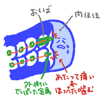 上の一番奥に着いた器具、下の器具それぞれほっぺた側に出っ張った部分があるのですが、いつものようにご飯を食べたら1噛み目に頬っぺたの内側が器具に引っかかって頬肉を噛み、血豆ができ、2噛み目で血豆が潰れて口内が血だらけに…