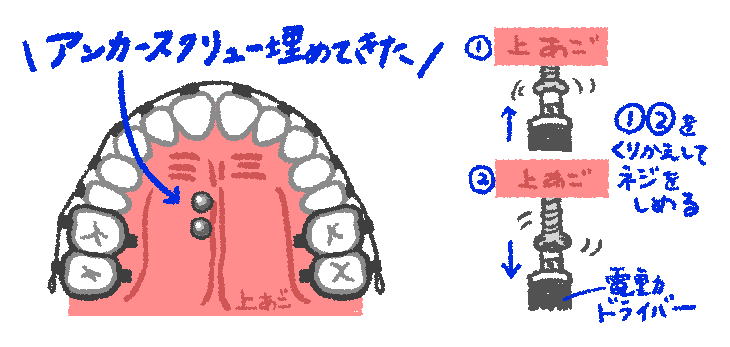 上顎部分にしっかり麻酔をして、ネジを回転させながら上顎の骨に埋めていきます。
