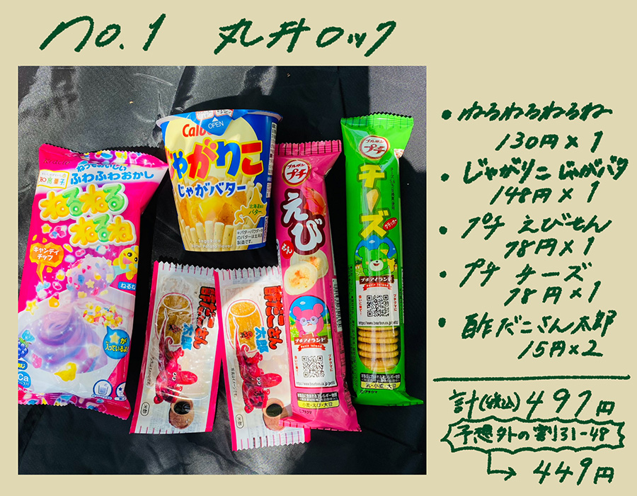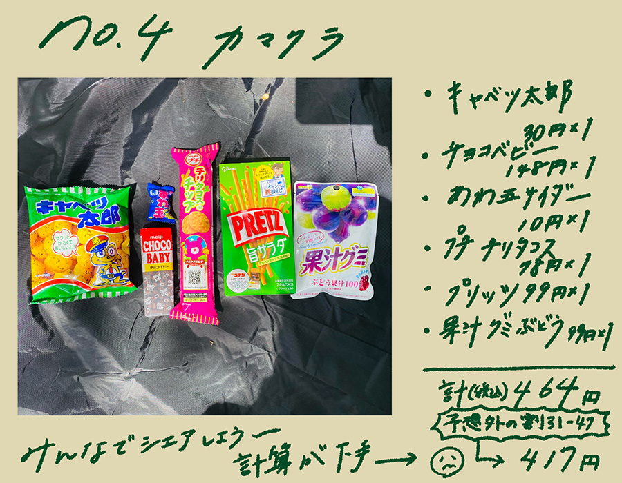 今回は大人の遠足ということと、昨今の物価高を鑑みて、「税込500円以内」を条件におやつを買ってきてもらいました。